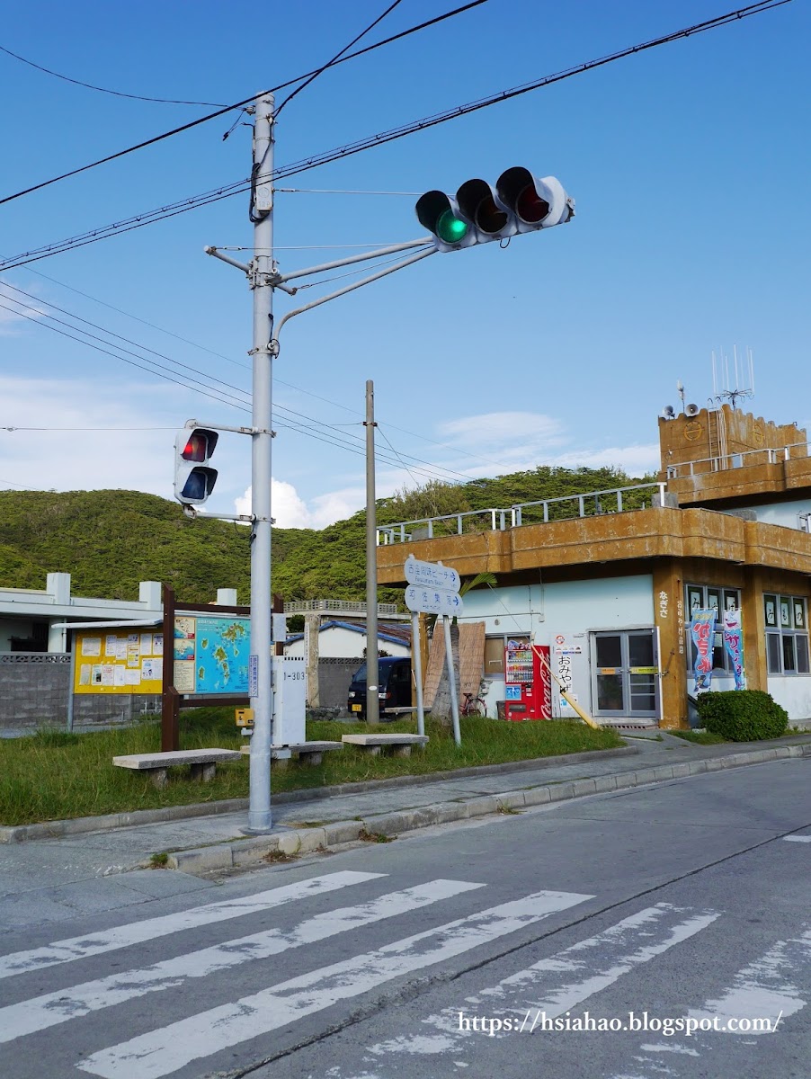 (第一次在慶良間島看到紅綠燈,而這也是唯一的紅綠燈!另外發生一件有趣的事情,他們總說綠燈是Blue,但我一直堅持說是Green,看了很多遍確認是綠色沒錯啊!後來才知道原來他們知道藍綠差別,只是因語言上他們習慣中國傳統的「青」字,所以會直覺性的說出Blue,語言真是很有意思!)