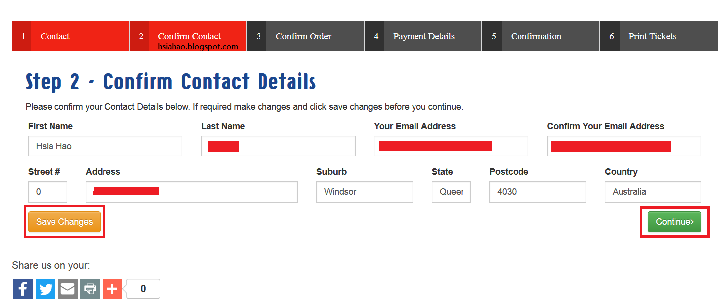 (接下來看到了總共需要六步驟完成購票,第一步當然就是需要輸入基本資料的頁面,輸入完成後點擊「Continue (繼續下一步)」)