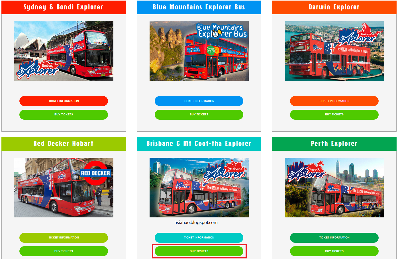 (進入網站後會看到這樣的介面,選擇代表布里斯本兩條觀光導覽巴士的淺藍色區塊中的「BUY TICKETS (購買票券)」)