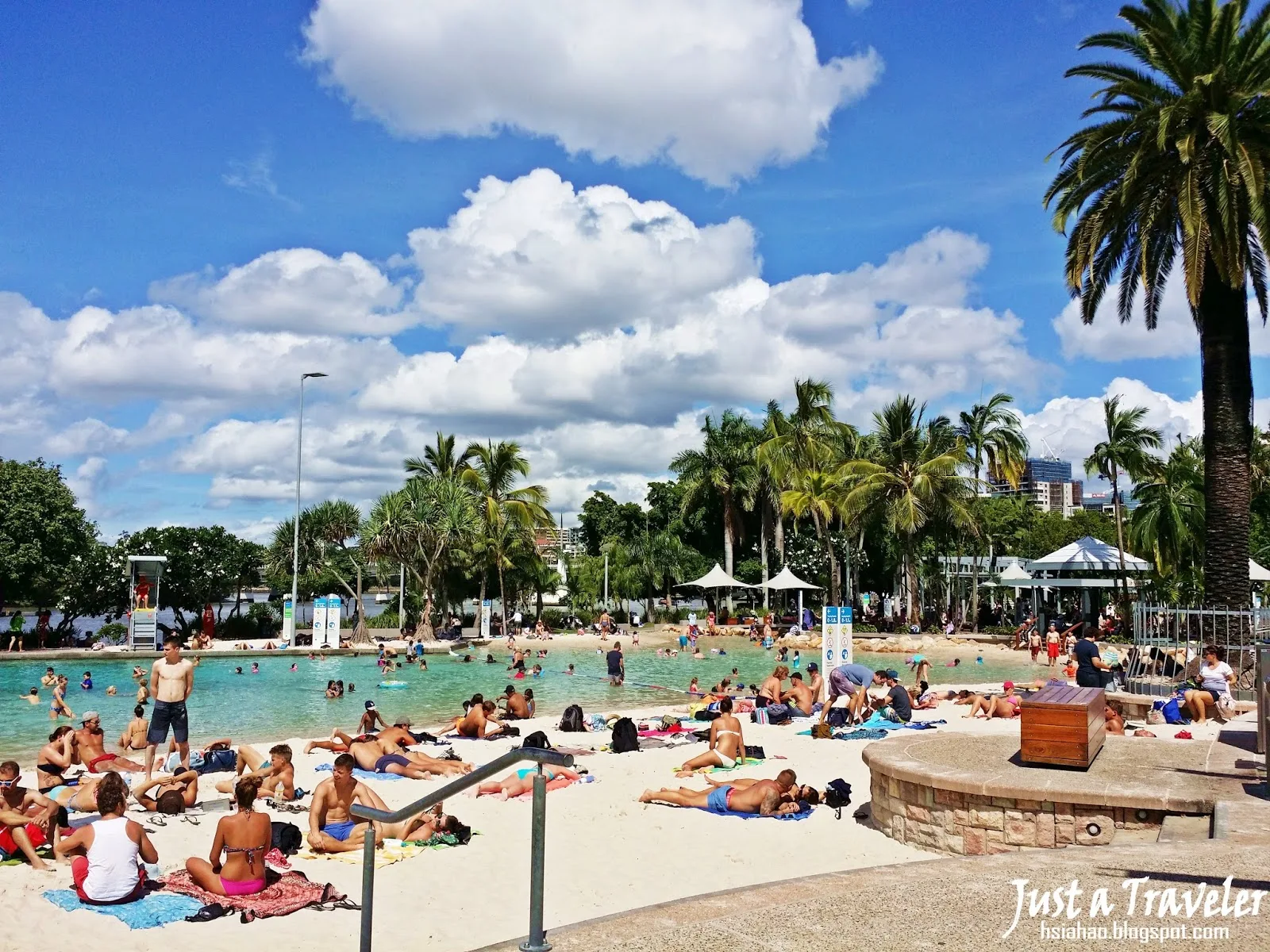 (園內最重要、最大的特色當然非這個美麗的人工海灘莫屬了!在夏天時這裡總是充滿玩水的大人小孩,也有兒童專屬的安全泳池、救生員等等,如來訪布里斯本,不妨就來體驗看看在市中心旁游泳的特別感覺吧!)