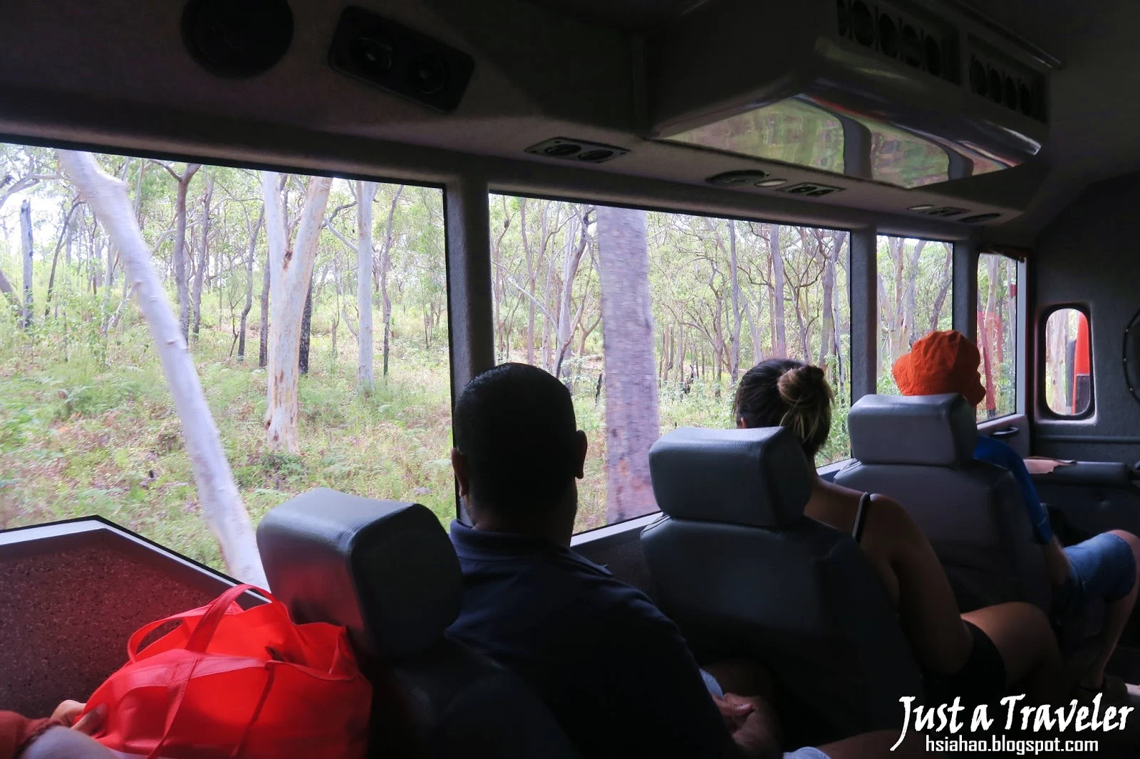 (跟團的旅客會搭乘四輪驅動的巴士,島上是沒有柏油陸地的,真的是一路顛簸的穿越叢林,這敘述絕對不誇張!)