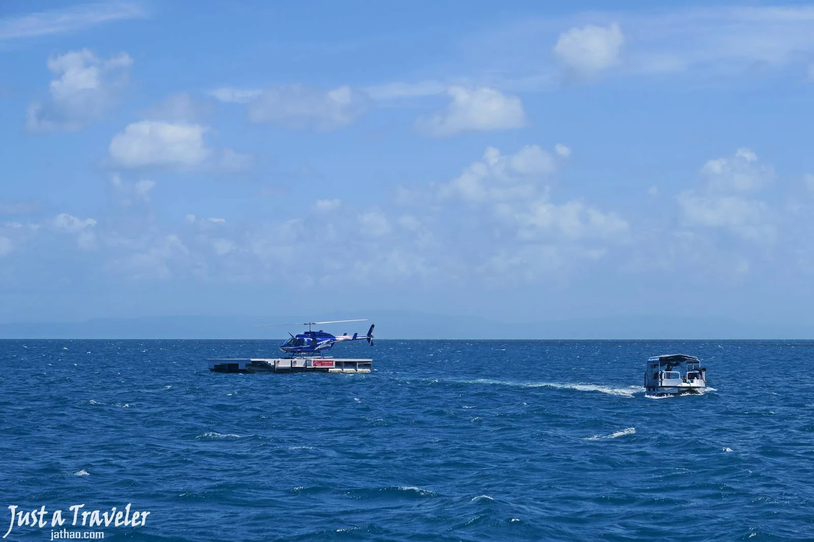 (接著就到了第二個潛點,第二個潛點稍微不一樣的是,除了同樣可自由浮潛外,如有參加「直升機」行程的旅客會在這時段搭乘,會先搭船到海中的平台,再上直升機)