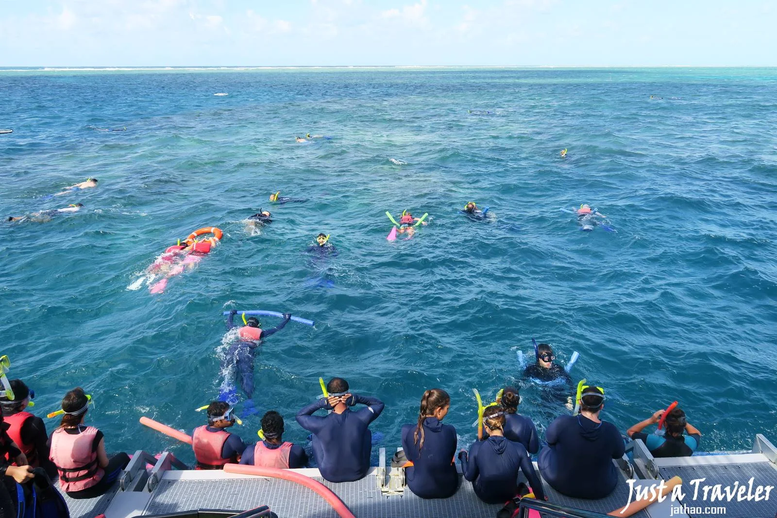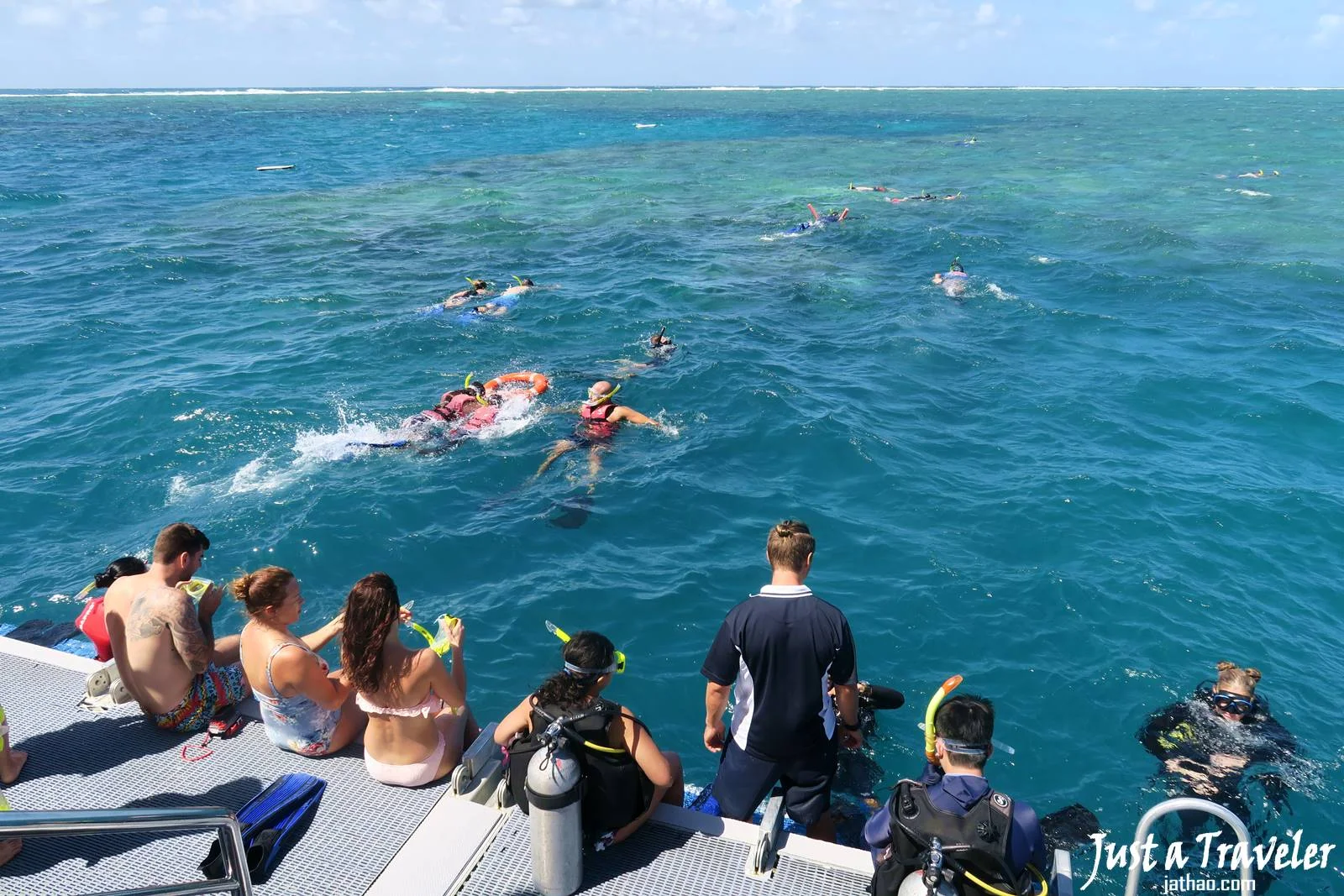 (航行到外堡礁大約需2小時左右,Down Under的船分成三層,第一層是餐廳、潛水換裝區,其餘都是遊客能休息的地方,也有很多戶外空間,讓大家享受陽光,我的經驗是,其實船真的蠻晃的,建議會暈船的遊客除了要吃暈船藥外,可以多待在外面吹風,因為真的蠻多人暈船的)
