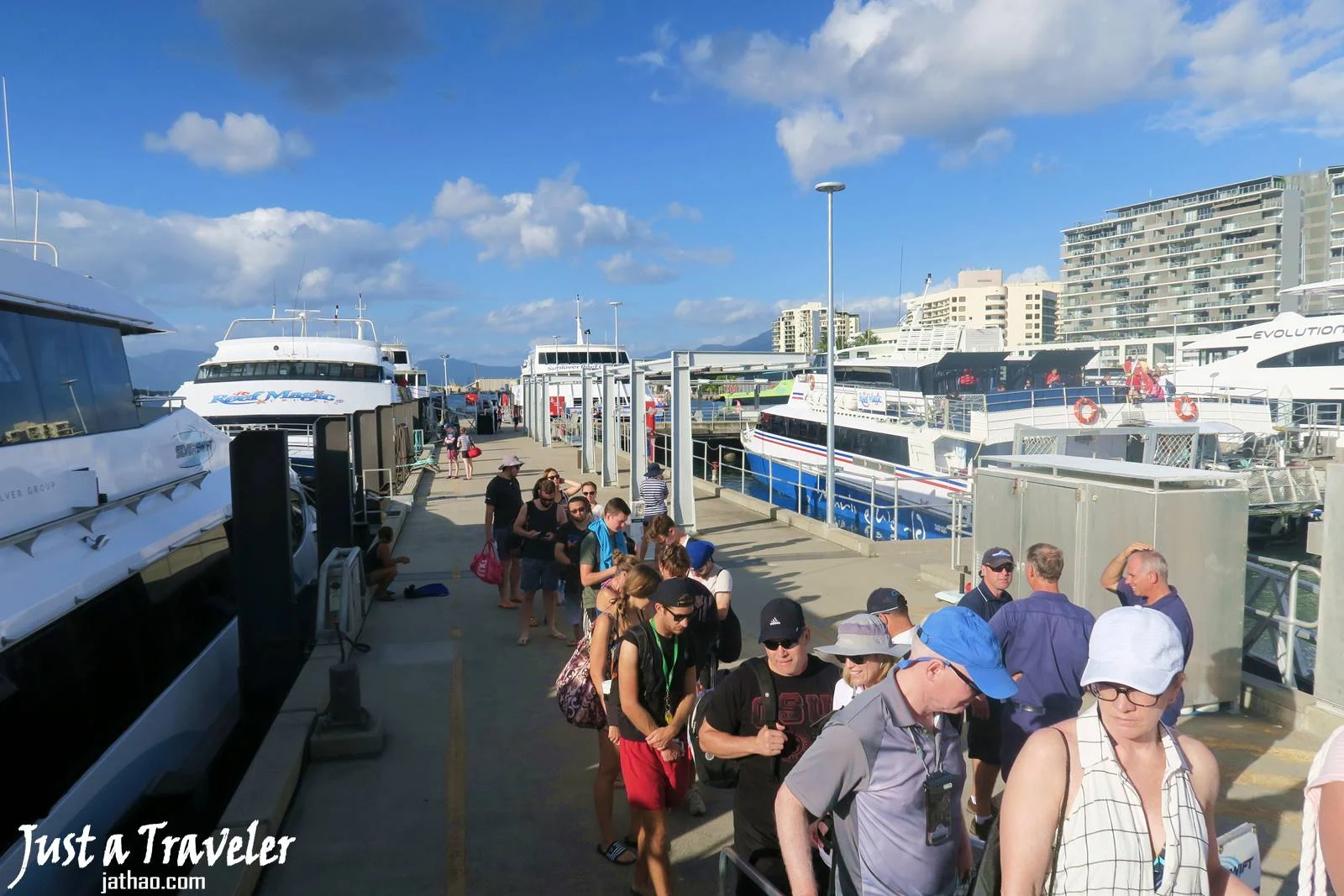 (與大多船公司一樣,遊客需要到「凱恩斯港(Reef Fleet Terminal)」報到,每個櫃台都有標明公司名稱,非常顯眼,而Down Under的報到時間是7點半)