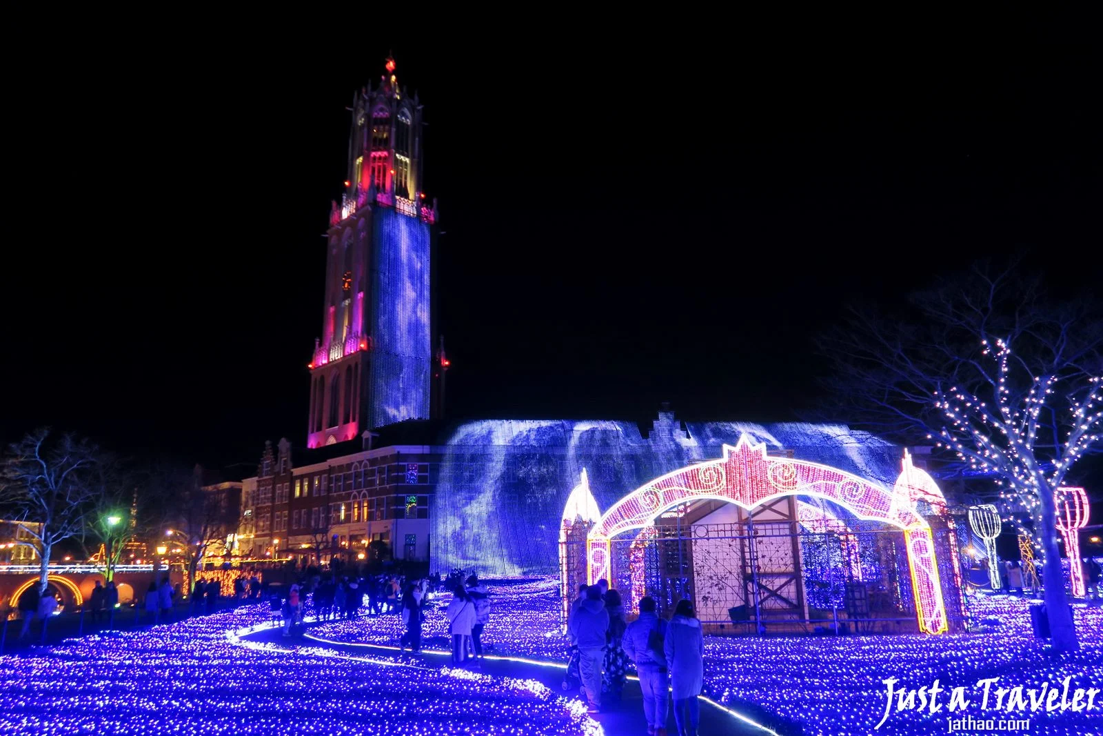 (豪斯登堡的夜景主題為「光之王國」,被認定為日本三大夜景之一,官方說法是由1300萬顆燈泡組成的「世界最大燈光秀」,精華就位在「藝術花園」內,能欣賞到高66公尺的「光之瀑布」,以及各處超美夜景!)