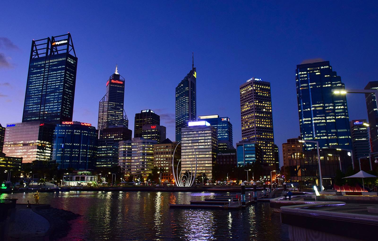 (伊莉莎白港中央有個稱為「Spanda」的漣漪狀雕塑,與後面的伯斯市區建築形成美麗的景觀)