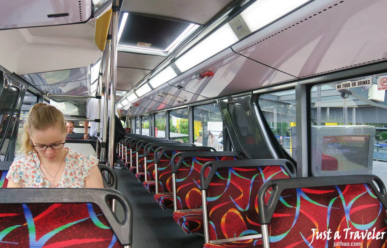 (SkyBus有兩種車型,沒有一定時間安排,一種是雙層巴士,一種是一般公車,但都沒有排號,先上車先坐,有能放置行李的區域,也都有免費Wifi能使用,自己比較喜歡雙層的,因為風景比較好,哈!)